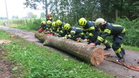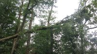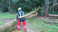 Der zweite, noch in den Baumkronen hängende Baum, wurde freigeschnitten und mittels unserer Seilwinde heraus gezogen. Beim herausziehen des Baumes wurde ein weiterer Baum beschädigt und musste ebenfalls zerkleinert werden, damit von diesem keine Gefahr mehr ausgehen kann.